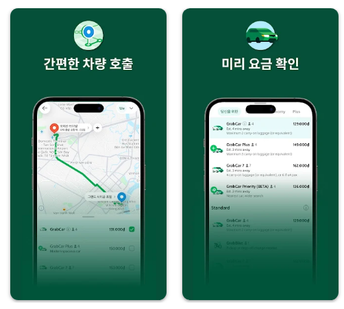 첫 번째로 차량 호출 서비스입니다. GrabTaxi, GrabCar 등의 서비스를 통해 원하는 차량을 선택해 이동할 수 있으며, 호출 전에 예상 요금을 확인할 수 있어 바가지 요금 걱정이 적습니다.