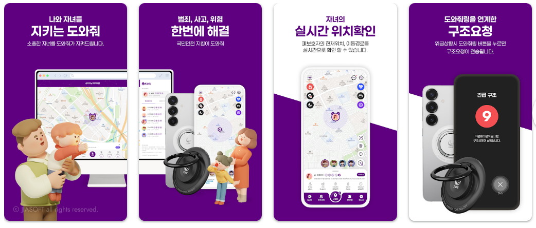 도와줘는 국내 환경에 최적화된 정밀도를 제공하는 국산 안심 서비스 앱입니다. 자녀 안전뿐 아니라 여성 안심 귀가와 치매 어르신 위치 파악 등 사회적 안전망 역할을 수행합니다.