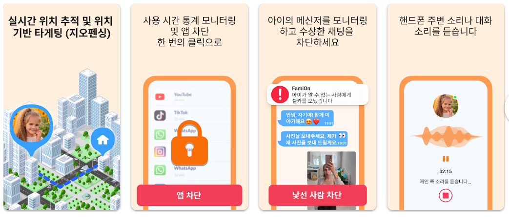 단순 위치 파악을 넘어 자녀 주변 상황을 이해하는 독특한 기능을 포함합니다. 전화를 받지 않는 상황 등 위험이 감지될 때 부모가 능동적으로 대처하도록 돕는 도구들이 스토어에 명시되어 있습니다.